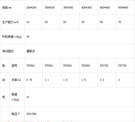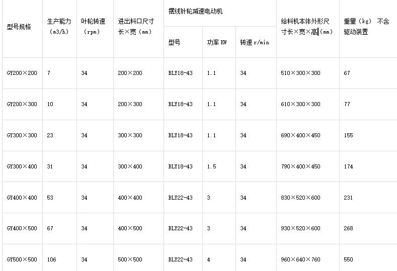 GY系列剛性葉輪給料機性能: