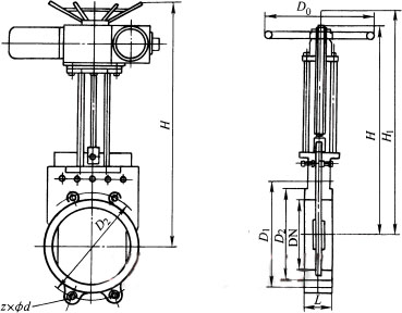 Z73X、Z373X 型 PN2.5~PN16 鑄鐵對(duì)夾式漿液閥外觀尺寸: